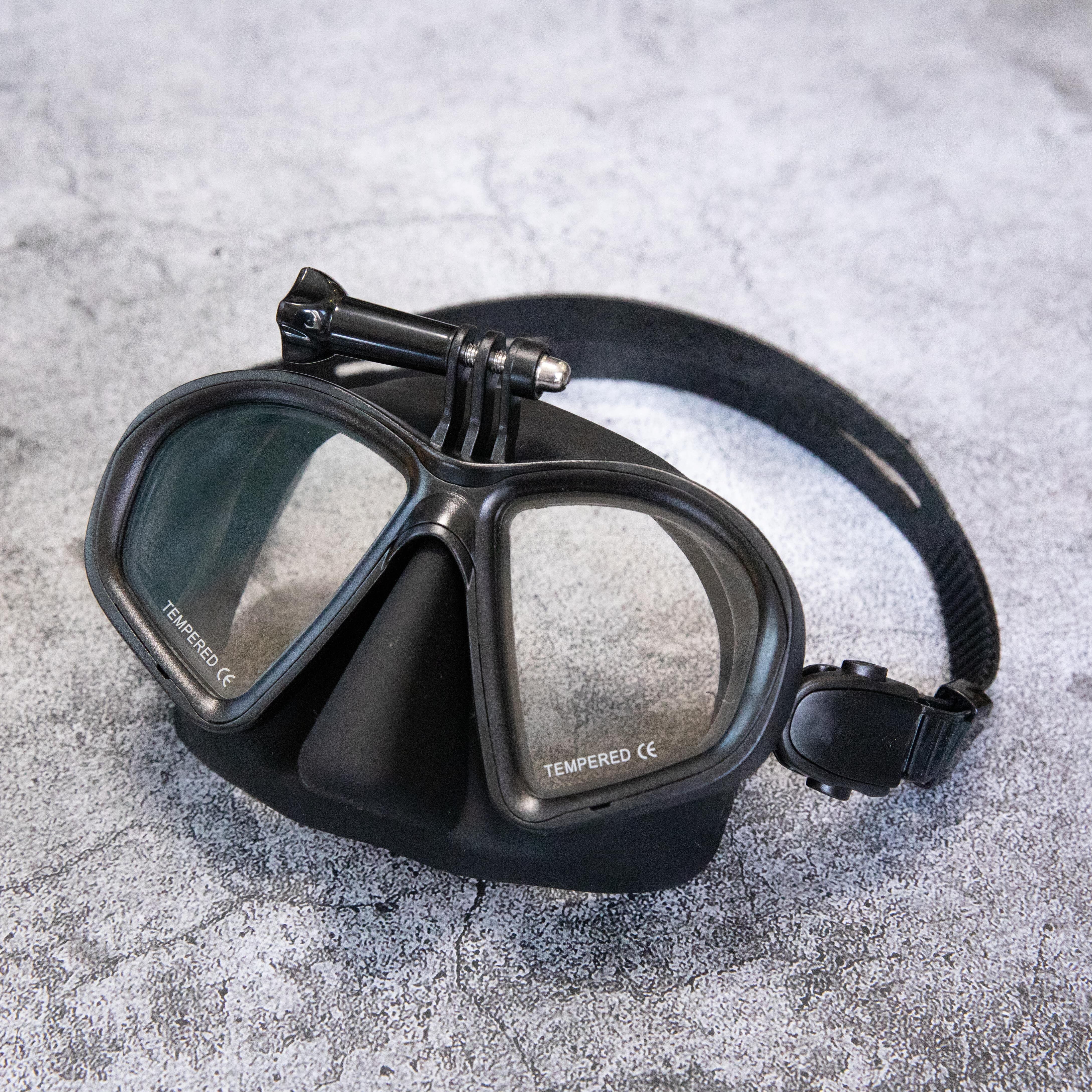 GoProなどアクションカメラが取り付けできるマウント付きゴーグルと、小さく折りたためるスノーケルのセット。